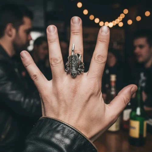 For a cohesive and striking look, combine the Middle Finger jewelry with complementary accessories that reinforce your personal aesthetic. The textured wrist presence of the Viking Battle Bracelet pairs especially well with this ring, creating a powerful combination of symbolic strength. For a contrasting statement, consider the refined silhouette of the Realism Skull Ring 925 Silver No Jaw Skull Ring on another finger to balance boldness with subtlety.